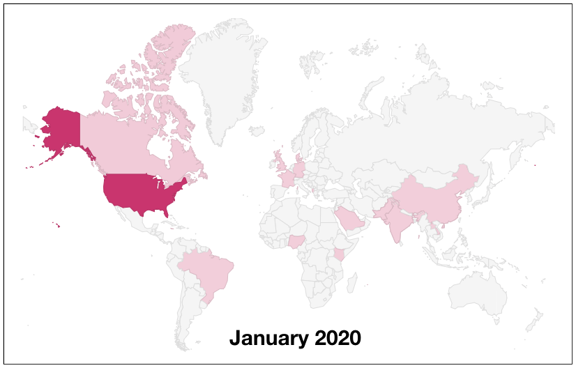 WordfortheWay.com touched all of the countries colored in pink on the above map during the month of January.