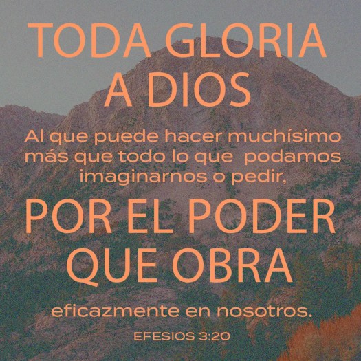 Efesios 3:14-21 (NVI) 14 Por esta razón me arrodillo delante del Padre, 15 de quien recibe nombre toda familia en el cielo y en la tierra. 16 Le pido que, por medio del Espíritu y con el poder que procede de sus gloriosas riquezas, os fortalezca en lo íntimo de vuestro ser, 17 para que por fe Cristo habite en vuestros corazones. Y pido que, arraigados y cimentados en amor, 18 podáis comprender, junto con todos los santos, cuán ancho y largo, alto y profundo es el amor de Cristo; 19 en fin, que conozcáis ese amor que sobrepasa nuestro conocimiento, para que seáis llenos de la plenitud de Dios. 20 Al que puede hacer muchísimo más que todo lo que podamos imaginarnos o pedir, por el poder que obra eficazmente en nosotros, 21 ¡a él sea la gloria en la iglesia y en Cristo Jesús por todas las generaciones, por los siglos de los siglos! Amén.