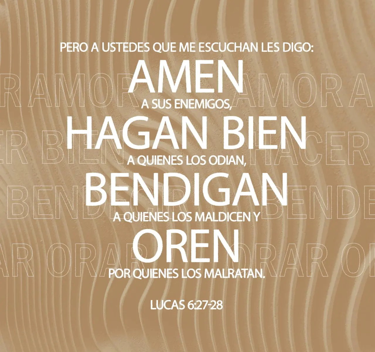 Lucas 6:27-31 (NVI) 27 »Pero a vosotros que me escucháis os digo: Amad a vuestros enemigos, haced bien a quienes os odian, 28 bendecid a quienes os maldicen, orad por quienes os maltratan. 29 Si alguien te pega en una mejilla, vuélvele también la otra. Si alguien te quita la camisa, no le impidas que se lleve también la capa. 30 Dale a todo el que te pida y, si alguien se lleva lo que es tuyo, no se lo reclames. 31 Tratad a los demás tal y como queréis que ellos os traten a vosotros.