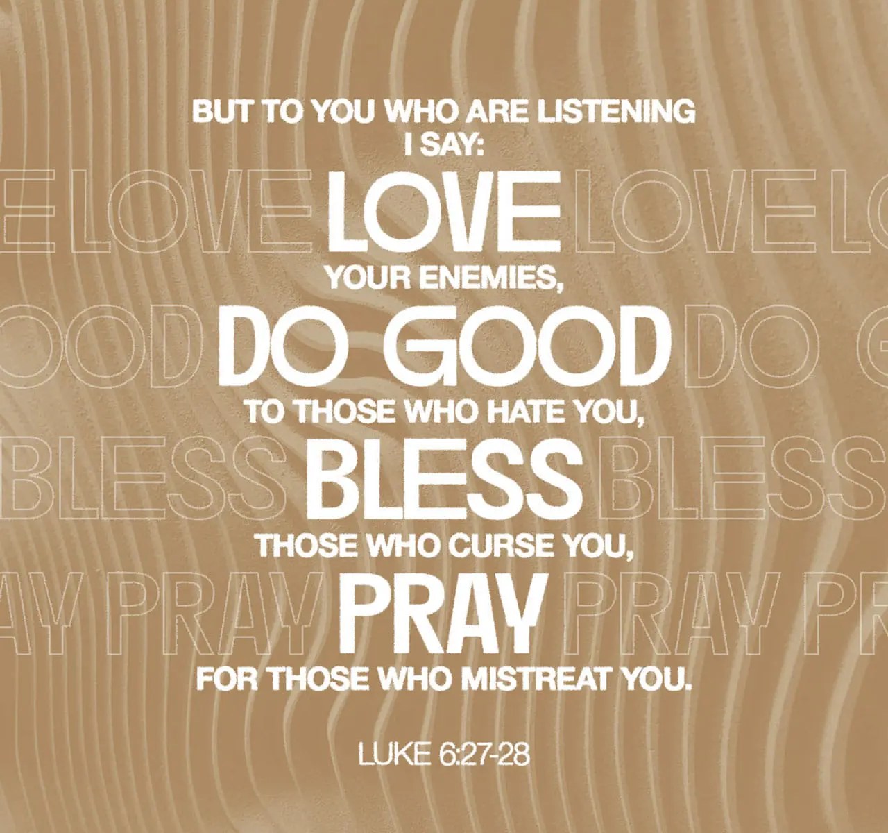 Luke 6:27-31 (NKJV) 27 “But I say to you who hear: Love your enemies, do good to those who hate you, 28 bless those who curse you, and pray for those who spitefully use you. 29 To him who strikes you on the one cheek, offer the other also. And from him who takes away your cloak, do not withhold your tunic either. 30 Give to everyone who asks of you. And from him who takes away your goods do not ask them back. 31 And just as you want men to do to you, you also do to them likewise.