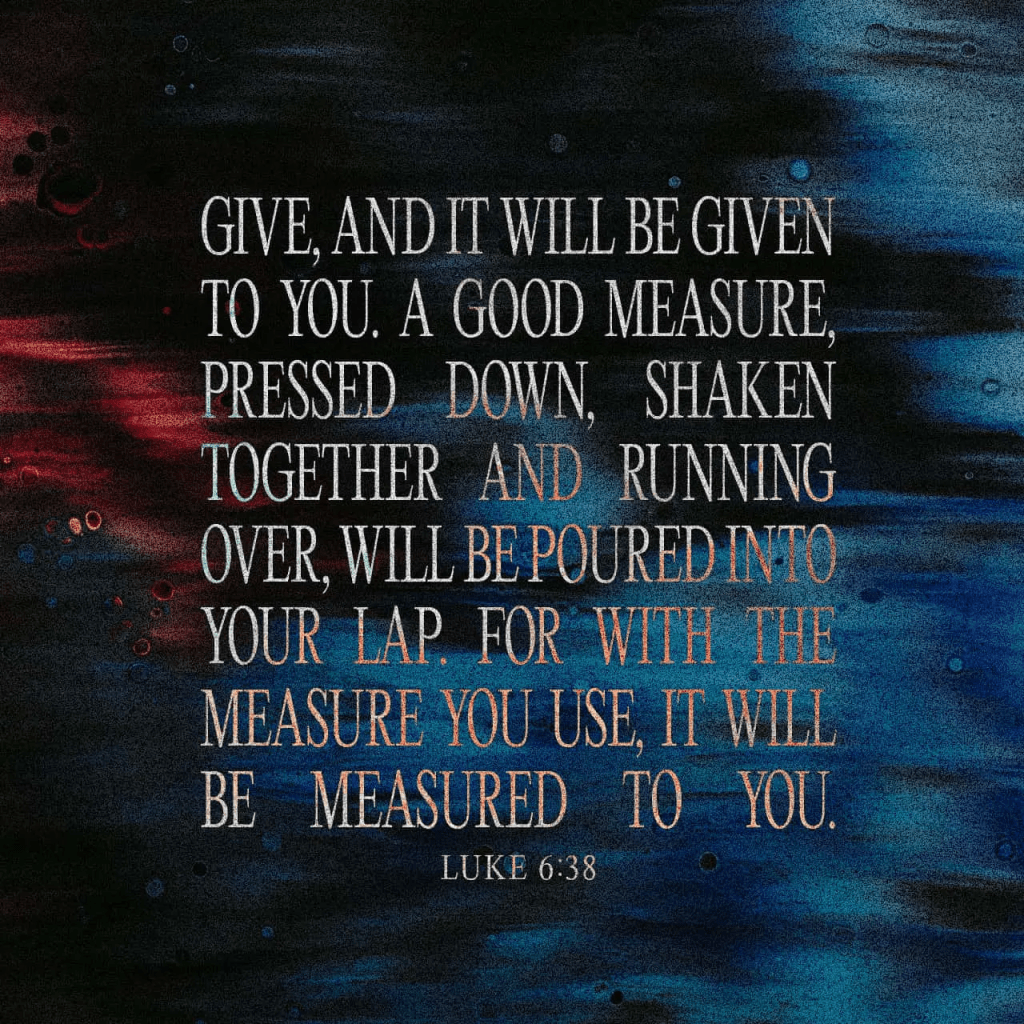 38 Give, and it will be given to you: good measure, pressed down, shaken together, and running over will be put into your bosom. For with the same measure that you use, it will be measured back to you.