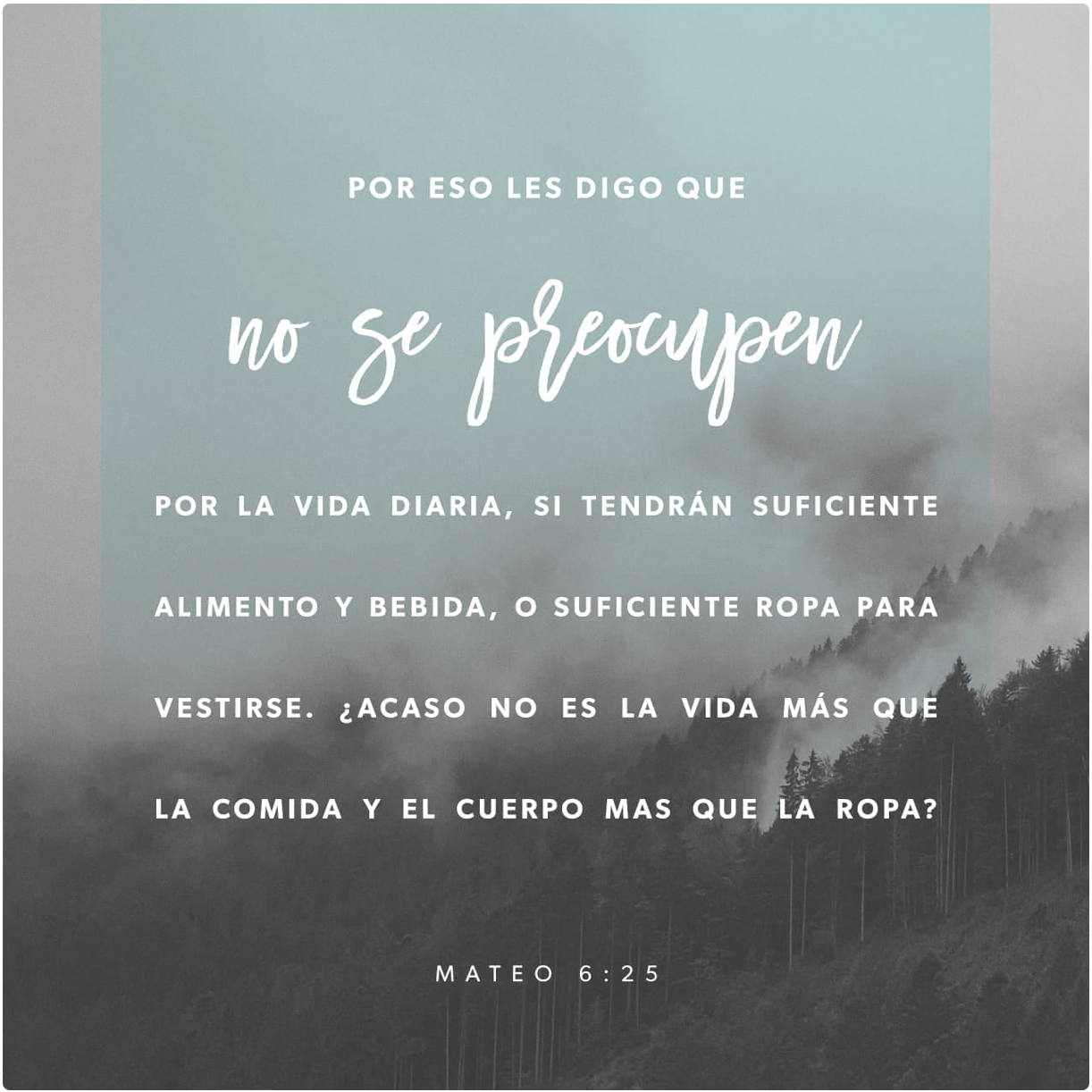 Mateo 6:25-34 (NVI) 25 »Por eso os digo: No os preocupéis por vuestra vida , qué comeréis o beberéis; ni por vuestro cuerpo, cómo os vestiréis. ¿No tiene la vida más valor que la comida, y el cuerpo más que la ropa? 26 Fijaos en las aves del cielo: no siembran ni cosechan ni almacenan en graneros; sin embargo, el Padre celestial las alimenta. ¿No valéis vosotros mucho más que ellas? 27 ¿Quién de vosotros, por mucho que se preocupe, puede añadir una sola hora al curso de su vida? » 28 ¿Y por qué os preocupáis por el vestido? Observad cómo crecen los lirios del campo. No trabajan ni hilan; 29 sin embargo, os digo que ni siquiera Salomón, con todo su esplendor, se vestía como uno de ellos. 30 Si así viste Dios a la hierba que hoy está en el campo y mañana es arrojada al horno, ¿no hará mucho más por vosotros, gente de poca fe? 31 Así que no os preocupéis diciendo: “¿Qué comeremos?” o “¿Qué beberemos?” o “¿Con qué nos vestiremos?” 32 Los paganos andan tras todas estas cosas, pero el Padre celestial sabe que necesitáis de todo esto. 33 Más bien, buscad primeramente el reino de Dios y su justicia, y todas estas cosas os serán añadidas. 34 Por lo tanto, no os angustiéis por el mañana, el cual tendrá sus propios afanes. Cada día tiene ya sus problemas.