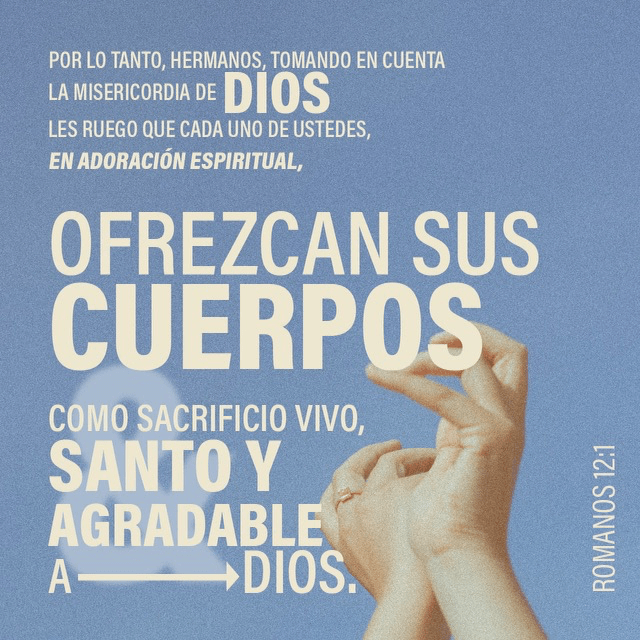 1 Por lo tanto, hermanos, tomando en cuenta la misericordia de Dios, os ruego que cada uno de vosotros, en adoración espiritual, ofrezca su cuerpo como sacrificio vivo, santo y agradable a Dios.
