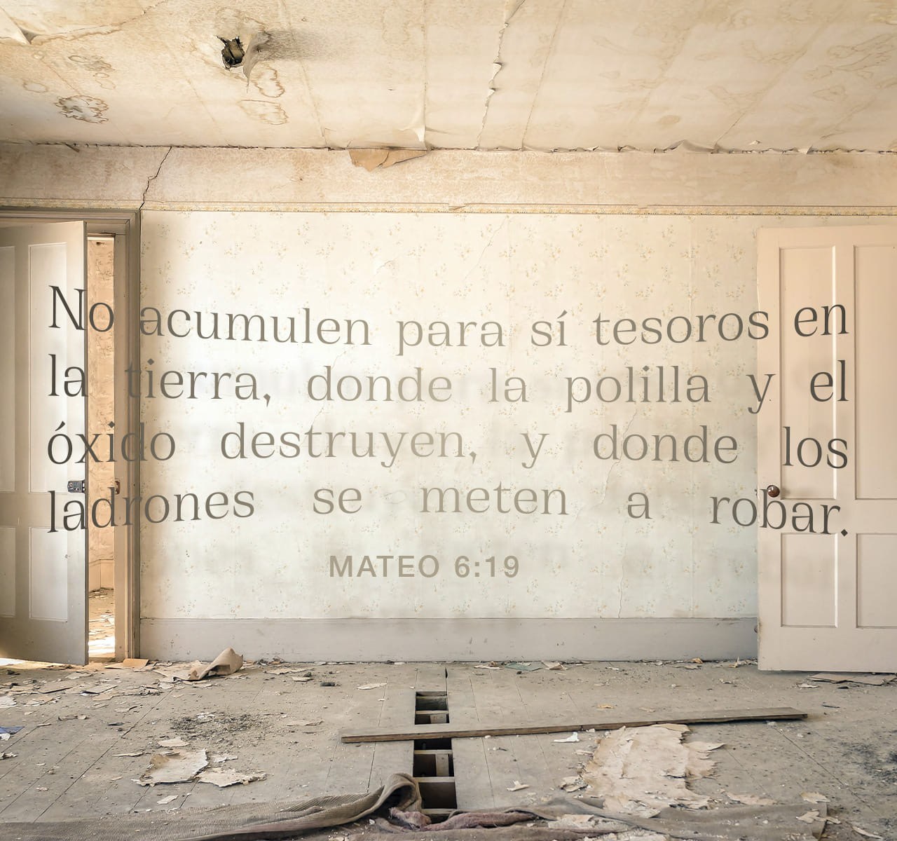 19 »No acumuléis para vosotros tesoros en la tierra, donde la polilla y el óxido destruyen, y donde los ladrones se meten a robar.