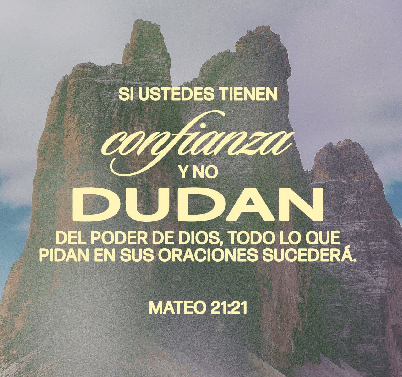 Mateo 21:18-22 (NVI) 18 Muy de mañana, cuando volvía a la ciudad, tuvo hambre. 19 Al ver una higuera junto al camino, se acercó a ella, pero no encontró nada más que hojas. ―¡Nunca más vuelvas a dar fruto! —le dijo. Y al instante se secó la higuera. 20 Los discípulos se asombraron al ver esto. ―¿Cómo es que se secó la higuera tan pronto? —preguntaron ellos. 21 ―Os aseguro que, si tenéis fe y no dudáis —respondió Jesús—, no solo haréis lo que he hecho con la higuera, sino que podréis decirle a este monte: “¡Quítate de ahí y tírate al mar!”, y así se hará. 22 Si creéis, recibiréis todo lo que pidáis en oración.