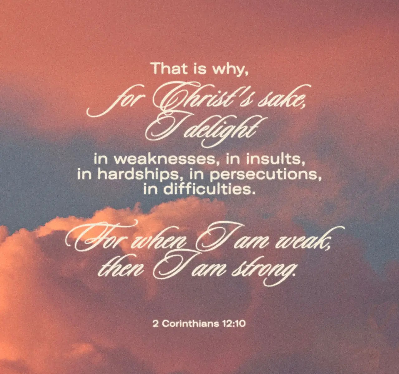 10 Therefore I take pleasure in infirmities, in reproaches, in needs, in persecutions, in distresses, for Christ’s sake. For when I am weak, then I am strong.